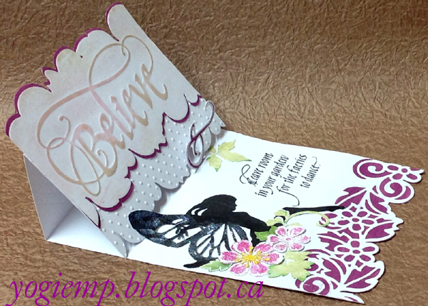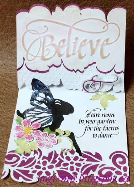 Created: March 26, 2015 We're having a DIE-ING FOR SPRING BLOG HOP Mar 30 to Apr 3rd using Suzanne's newest dies - love them. She came out with 3 - Believe, Thanks & Hello. I'm also using a quote stamp on the inside from Quietfire Design and some eCuts available on the Silhouette onLine store ("Leave Room in Your Garden"); die ("Believe"); eCuts (Fairy "Fairy Leaping"); (ampersand "Live Long & Prosper")