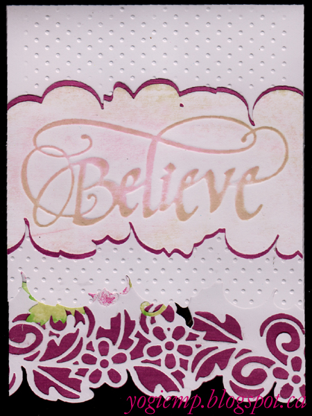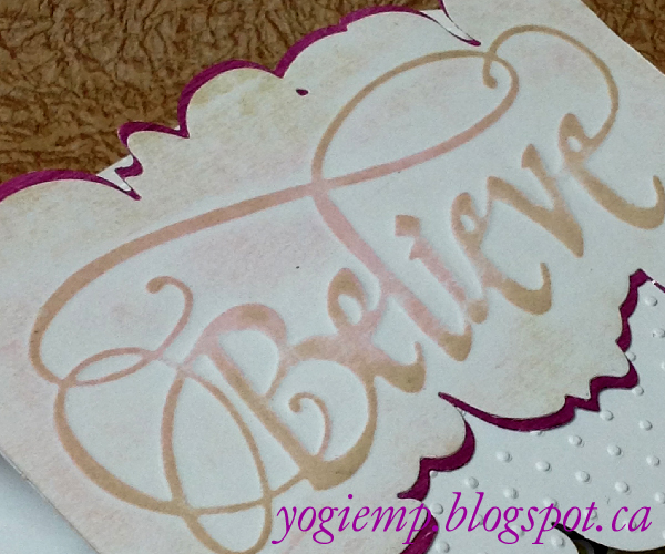 Die cut the word "Believe" from 110# white cardstock twice and glued them together to get a nice thick layer. Lay the word (right side up) on my embossing machine platform, a piece of white 110# cardstock, tan mat (Spellbinders) and the rest of my sandwich. Ran through my machine with enough pressure to emboss without tearing the paper. (PS this technique gives a different embossed design than my other embossed card using the die for embossing which you can see HERE). Removed from machine and swiped over the high points with Distress "Spun Sugar" then "Old Paper". Die cut the edges (Creative Expressions Sue Wilson "Gemini - Delphinus") set. Die cut a 2nd layer slightly larger, painted the edges with Distress acrylic dauber "Seedless Preserves", then adhered the 2 layers together. I die cut a 3rd layer to splice on the bottom to extend my front piece. Dry embossed this 3rd layer and the top section of the front using Cuttlebug "Swiss Dots" embossing folder. Scored, die cut the inside bottom edge (using the design and edging elements of the die set), and folded my easel card (7" for the inside, then 2.25", and whatever is left over (approx 1.75"). Used the same edging element and die cut another layer, painted with the Preserves, then adhered under the the card floor, matching the floor layer. Trimmed off any excess. Adhered my embossed layer to the front (ps it is larger than the side fold piece (approx 4"). I needed it to cover the stamping on the floor, so positioned it accordingly - see the closed card image below (the toe of the fairy sticks out a bit - sigh!!).