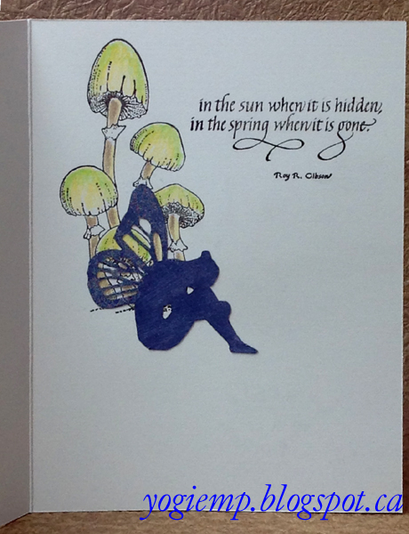 On the inside stamped the mushrooms (Chocolate Baroque "Autumn Poppy") using the black, colored with Prisma colored pencils. I had a 2nd fairy, colored with the Sapphire, wings glittered. Stamped the rest of the quote, masking the 1st line, inking with the black, removing the masking, and stamping.