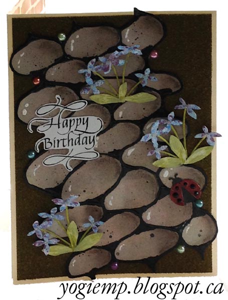 train building...), leaving a 1/8" border all around. Created my pattern, cut with my electronic cutter, and while on the mat, painted with Distress acrylic daubers (Pumice, Old Paper, & Browns). Removed the outline portion and inked with Versafine Black Onyx and embossed with Black embossing powder. Adhered to my card front, then started adhering the drop out pieces. Used an embossing marker and embossed with the black where the rocks meet the lines. Added white highlights using a Molotow fine tipped white pen, then spattered some black. The violas (Memory Box "Blooming Violet") die cut from white cardstock and while on the mat, painted with acrylic daubers. Assembled and adhered to path, then added a dab of Viva Glitter Line "Silver" to the centers of each flower. Stamped the sentiment on white cardstock using Versafine Black Onyx and clear embossed. Fussy cut very close to the script and adhered to front. Added various colors of half pearls, anchoring them with Glossy Accents. As a final touch, raided my die cut boxes and added the ladybug (eCraft Designs) |