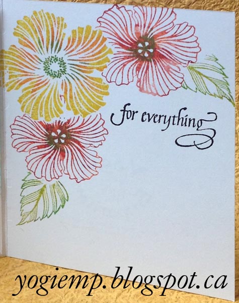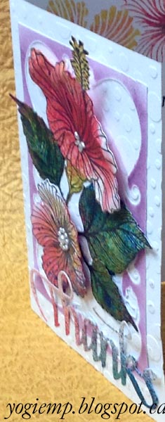 Created: May 9, 2015 I just got the newest stamp set from Designs By Ryn "Hibiscus" and it's a beautiful 8 pce set BIG GRIN so had to use them right away. I also made silhouette images so I could cut the outline with my electronic cutter and avoid fussy cutting everything and that's another BIG GRIN... I'm using the newest "Thanks" die on the outside and part of the "Thanks - cuddler set", plus "No Act of Kindness" quote stamp on the inside from Quietfire Design ("Thanks - Cuddler set" - 7pce set); ("No act of Kindness..."); ("Thanks" die)