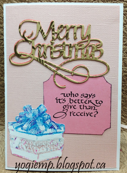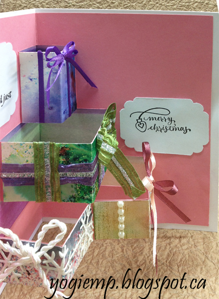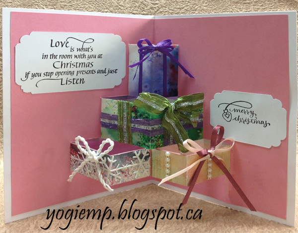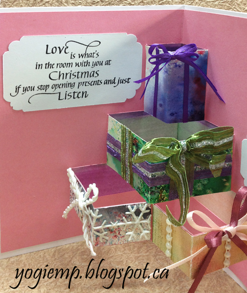 Cut a piece of pale pink Bazzill cardstock for the front leaving a white edge all around. Stamped the quote onto pink cardstock using Versafine Black Onyx and clear embossing. Trimmed down and punched corers with a circle punch. Hit the edges with a purple pad. Adhered to card. Die cut the "Merry Christmas" from Decorative paper adhered to a thin cardstock. Die cut a 2nd layer from a deeper pink cardstock. Adhered the 2 layers together off set slightly. Adhered to card. Created an eCut file for the present stamp (Flourishes "All Wrapped Up" set), stamped using Distress mini pads in pinks and blues, misted with water and stamped. Adhered to card front. On the inside: I cut my pink cardstock to size and cut/folded as per template. Penciled in a small dot for my cut lines onto my white card. Used Pan Pastels to swipe a horizontal line of color for each box area so it would look more like the box rather than the white card. Adhered the right side to my main white card, making sure my borders were even and the center crease butted to the center crease of my main card. Kept the pink layer folded, brought down the left side of my white card to adhere. Cut various pieces of decorative paper the size of each box and adhered, matching edges and center creases. Added ribbon trim, bows etc... Stamped the quote and sentiments using the Black Onyx on white cardstock, clear embossed. Trimmed down and punched with a decorative corner punch. Adhered to card. |