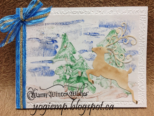 Side folded my white card, and embossed with Cuttlebug "Holly ribbons" embossing folder. Created the encaustic painting using Enkaustikos, my electric frying pan and thin Rice paper. Trimmed down and adhered to front. eCut the deer and sponged with a dirty brown sponge. Adhered to front. Stamped the sentiment using Versafine Black Onyx and clear embossed. Added the blue/gold Sari ribbon. On the inside: stamped the trees (Just for Fun "Pine Forest") using Versafine Black Onyx and embossed with Distress "Pine Needles" embossing powder. |