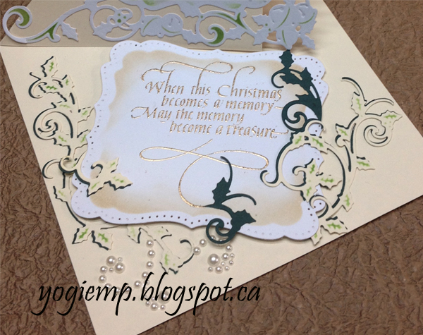 On the floor: Stamped the quote on to white cardstock using Versafine Toffee and embossed with "Queen's Gold" embossing powder. Die cut with (Spellbinders "Decorative Holly Frame" set) moving the die to get a larger die cut. Adhered to card floor with 3D foam tape and it becomes my stopper. Die cut the holly flourishes from cream toned cardstock and the dark green cardstock, shadow layering them. Adhered under and over the quote area. As a final touch added some pearl flourishes. |