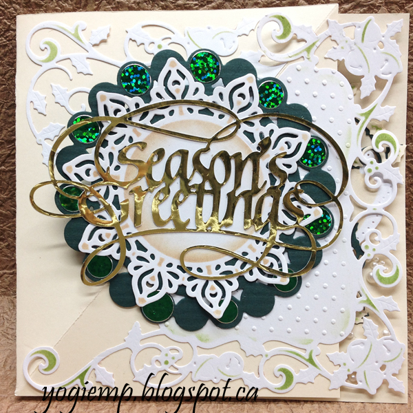 This side easel is the same basic structure as a normal side easel, but instead of cutting another piece the same size as your card base, just add on to the triangle shape of the fold... Scored and folded my cream toned cardstock. I die cut (Spellbinders "Holly Frame") the front base layer from white cardstock, sponging through the die with Distress "Mowed Lawn", then cutting it diagonally to fit the triangle shape and using scissors to cut around the leafy flourishes. Dry embossed using Cuttlebug "Swiss Dots" embossing folder in the center section only. Adhered to card. Die cut the dark green layer (Spellbinders "Beaded Circle") and adhered to card adding green holographic glitter circles (Stampendous "Green Holo Jumbo Circles"). Die cut the next layer (Spellbinders "Persian Motifs" set) from white cardstock, sponged with a dirty brown sponge and adhered to green layer. Die cut the "Season's Greetings" from gold adhesive backed contact paper. Adhered to card. |