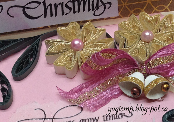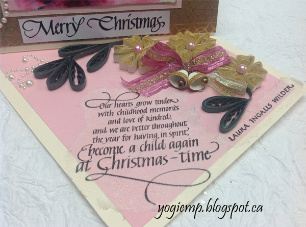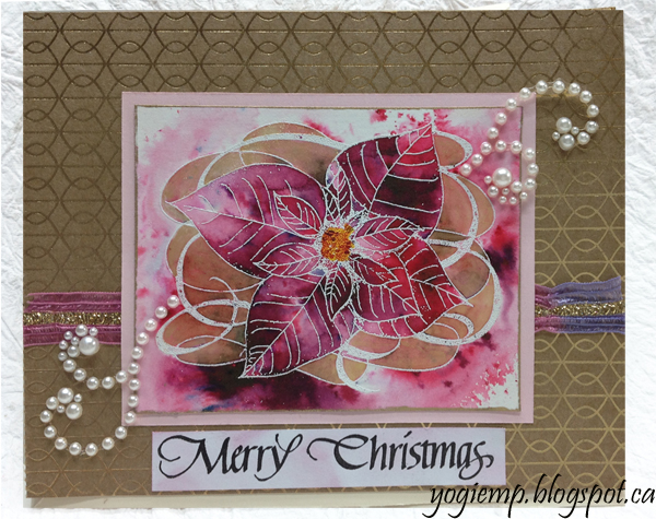 Scored and folded my cream toned side easel card. Cut a piece of decorative gold printed Kraft cardstock and adhered to front. Adhered a piece of pink/purple variegated Sari ribbon. Stamped the poinsettia using Versamark on 90# watercolor paper, smooth side, and embossing with white embossing powder. Misted the paper and sprinkled Color Burst (Merlot, Alizarin Crimson) and misted a bit more. Dried. Painted in the negative spaces of the flourishes using QoR gold paint. Trimmed down and edged with a Krylon gold leafing pen. layered on to a pink cardstock and cut a 1/8" border around the edges using a layering ruler. Adhered to card front. Added the pearl flourishes. Stamped the sentiment using Versafine Black Onyx, clear embossed on white cardstock. Trimmed down and sponged with a dirty pink sponge. Adhered to card front. |