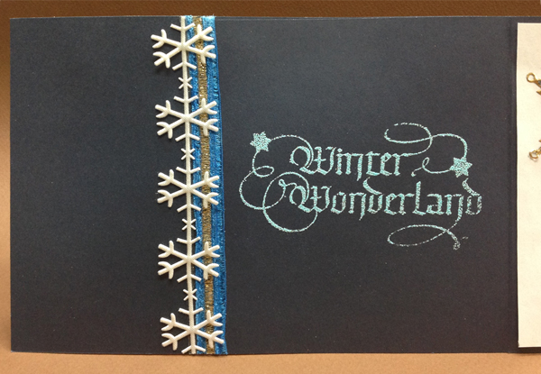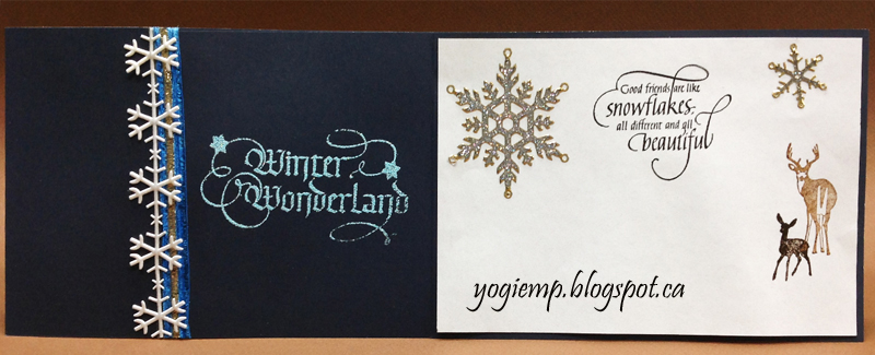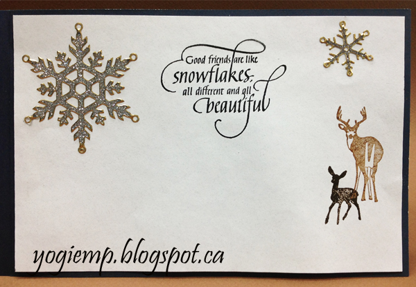 I scored and folded my dark blue cardstock. Since it not wide enough to complete the card, adhered a front piece on the hang over. Printed out the frame image in white cardstock. Stamped the trees (Deep Red "Winter Pines" & Just For Fun "Pine Forest") using Distress "Forest Moss" & hitting here and there with "Ground Espresso", stamping and clear embossing. Wet my sky area and charged it with QoR watercolors in Manganese Blue and Ultramarine. Dried. Used a very light wash of the blue in the foreground. Dipped my brush into some Copic white opaque ink diluted with water and splattered to mimic snow. Stamped the sentiment using Versafine Black Onyx and clear embossed. eCut the deer from white cardstock and colored the top layer with a dirty brown sponge, adhered the 2 layers together and then on to the card. Painted the frame design with gold QoR. Dried. Added some of the light blue wash to parts of the frame. Used a Quickie glue pen in the corner designs and sprinkled with Stickles dry glitter "Diamonds". Final touch added light blue rhinestones. On the inside left: Covered the hang over join with the blue/gold Sari ribbon and added a white snowflake ribbon. Stamped the sentiment using Versamark and embossed with Hot Stuff "Turquoise Shimmer" embossing powder. On the inside Right: adhered a piece of granite stationary. Adhered the Peel Off glitter snowflakes (Elizabeth Craft Designs). Stamped the quote using the black and clear embossed. Stamped the deer with Distress browns. |