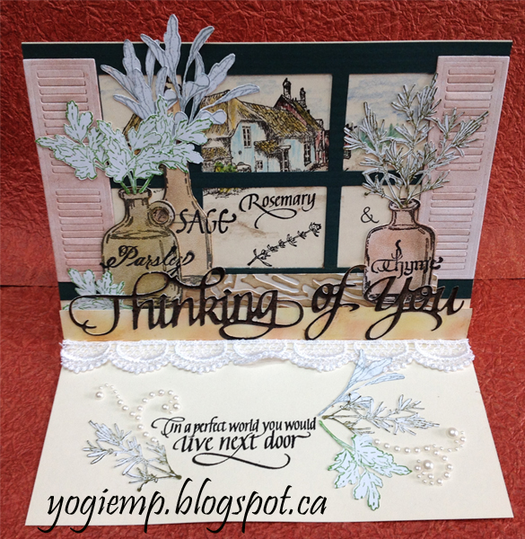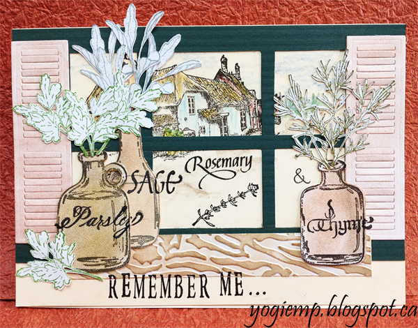 Scored and folded my cream toned cardstock to create my easel. Cut a top layer from the cream. Stamped the English cottage (Rick St Denis) using Versafine Black Onyx. Colored with Prisma colored pencils. Cut a green textured layer with window panes. Adhered to front panel Die cut the shutters (Memory Box "Madison Window Shutter Large") from Soft Finish cardstock and colored with Metallic Pan Pastels in a copper tone. Adhered to green layer. Cut a narrow rectangle to act as a window ledge/shelf. Embossed with Elizabeth Craft Designs "Bark" embossing folder. Hit the high points with Distress "Old Paper" and sponged a bit of "Tea Dye" in the crevices. Adhered to window. I had created eCuts for the jars (Heartfelt Creations "Jars & Vines") a while back and cut from Soft Finish cardstock, colored with various browns and yellow Pan Pastels. Adhered to shelf. Created eCut silhouette images of the herbs and cut from white cardstock, stamped with Distress greens in the color closest to that herb. Adhered pleasingly in each jug. Stamped the herb names using the black and added an ampersand with a black micron pen. Stamped the words "Remember Me..." (Part of the Simon and Garfunkel song BIG GRIN) On the floor: Die cut the "Thinking of You" from white cardstock, inked with Versafine Toffee and embossed with Hot Stuff "Burnt Copper Leaves" twice. Cut a rectangle piece the width of the card, scored it at 3/4" to adhere my die cut words, trimmed off the balance to about 1/4" deep and adhered to floor to act as my stopper. |