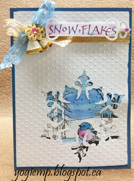 I scored and folded my medium toned blue cardstock. Trimmed down the snowflake piece and ran through my embossing machine with Cuttlebug "Swiss Dots" embossing folder twice to cover the whole piece. Stamped the bird scene (Penny Black "Winter Song") on white cardstock using Versafine Black onyx and painted with QoR watercolors. Dried and embossed the snowflakes with Silver Opal embossing powder, trimmed down and adhered to snowflake piece then on to card front. Adhered a piece of pink/blue/beige variegated Sari ribbon. Tied a bow and adhered it and my quilled elements using a hot glue gun. Added a pink star shaped rhinestone to the center of the flower. Stamped the "snowflakes" word using Distress mini pads "Broken China" all over and hitting here and there with "Picked Raspberry", clear embossing. Die cut with Spellbinders "Fancy Tags" die set, moving the die to create a larger inner space, sponging with a dirty pink sponge. Adhered to card with 3D foam tape.