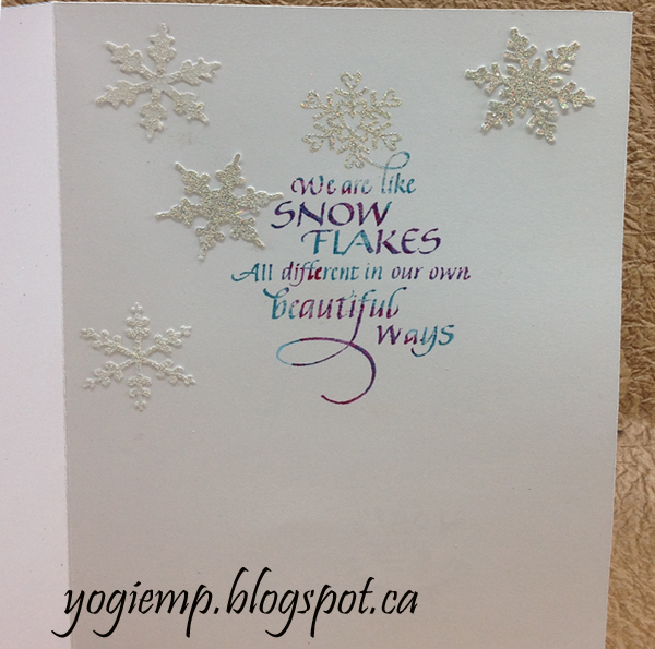 On the inside: stamped the quote as mentioned above. Punched a bunch of snowflakes using Martha Stewart & Paper Shaper snowflake punches from white cardstock. Inked them with Versamark and embossed a couple with "Silver Opal" and a couple with Hot Stuff "Fallen Snow". |