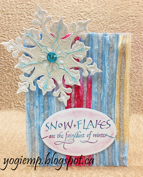 I scored and folded my white cardstock. Applied Sookwang tape all over the front and adhered the pink/blue variegated Sari ribbon all over... Die cut the snowflake and embossed the various pieces using Versamark and - largest with Hot Stuff "Fallen Snow" embossing powder; 2nd largest and smallest with "Silver Opal" embossing powder and the medium one with Turquoise Shimmer embossing powder. eCut a solid under layer and adhered the various pieces, then on to the card front off the edge. Added the large aqua rhinestone to the center. Stamped both the front and inside quotes using Distress mini pads inking all over with "Broken China" then here and there with "Picked Raspberry", stamping and clear embossing. The front quote I die cut with a Spellbinders oval die set and adhere to front. n the inside: die cut the snowflake corner (Memory Box "Frostyville Corner"), used the reverse side, burnishing first to smooth the edges, inking with the Versamark and embossing with the fallen snow embossing powder. Adhered to inside. Stamped the quote as mentioned above. |