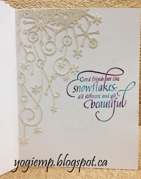 Created: October 17, 2015 I often want to use this large snowflake die cut but cringe... I have a lot of trouble die cutting it... But I keep persevering... At least I got 2 cards made with it this time. This one uses the positive of the shape. You can see the negative shape on this card HERE The rubber stamp quotes are by Quietfire Design ("Snowflakes are the Fairy Dust..." ); ("Good Friends are Like...")