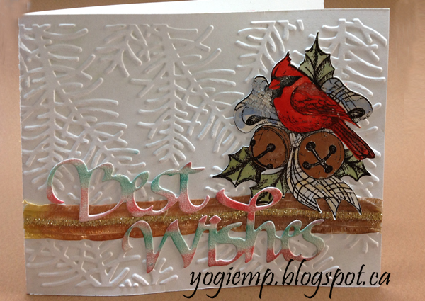 Side folded my white card. Embossed the front (ECD "Sprig") embossing folder. I created a silhouette image of the cardinal (no fussy cutting...) and cut from the smooth side of the Soft Finish cardstock (works nicely with watercolors as well as Pan Pastels) with my electronic cutter. Painted with ArtQuest palettes. Die cut the "Best Wishes" from the textured side of the soft finish cardstock and used red and green Pan Pastels. Adhered a piece of gold/glitter variegated Sari ribbon, then my cardinal and then my sentiment. |