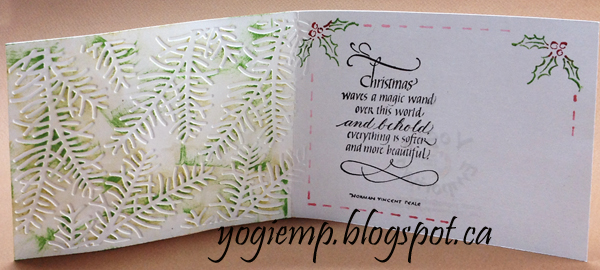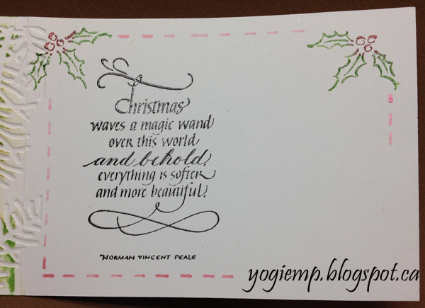 On the inside: On the left side I hit direct to paper with the large pads "Shabby Shutters" and "Mowed Lawn" On the right side, stamped the quote using Versafine Black Onyx and clear embossed. Stamped the holly inking with the mowed lawn and "Fired Brick". Repeated for the right corner. Added faux stitching using a red metallic gel pen |