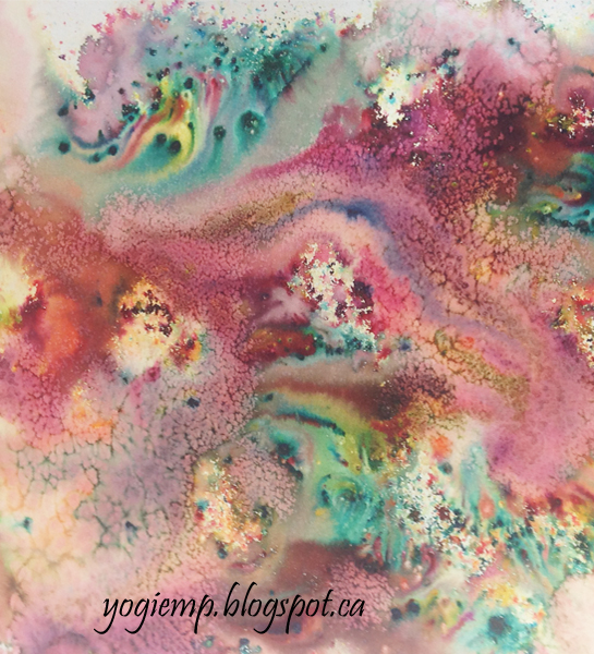 Color Burst Decorated paper: Mist 90# Canson cold press watercolor paper (wrong side - it's smoother...) with water. Sprinkle or burst some powder "Yellow Ochre" all over, then here and there with "Burnt Orange", "Merlot", "Terre Verte" & "Sepia". Mist with water some more avoiding some areas to get a more speckled look. Use the corner of a paper towel to soak up excess water so there are no puddles. Allow to partially dry. You want the paper to be nice and damp but not sopping wet. Then sprinkled with salt - I used regular table salt this time. Set your paper aside to dry completely naturally. |