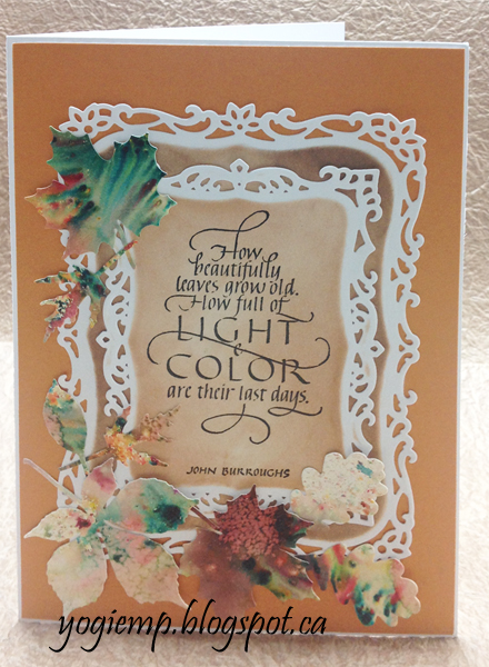 Created: September 5, 2015 I'm loving these leaves... Playing with my Ken Oliver "Color Burst" colors. And the Quietfire Design quote stamps: ("How Beautifully Leaves..." 3pce set)