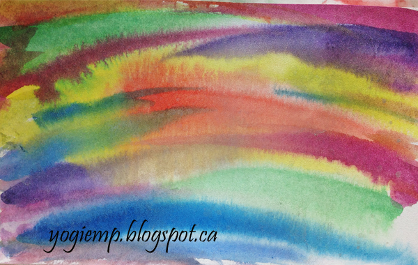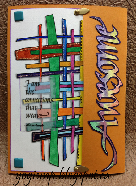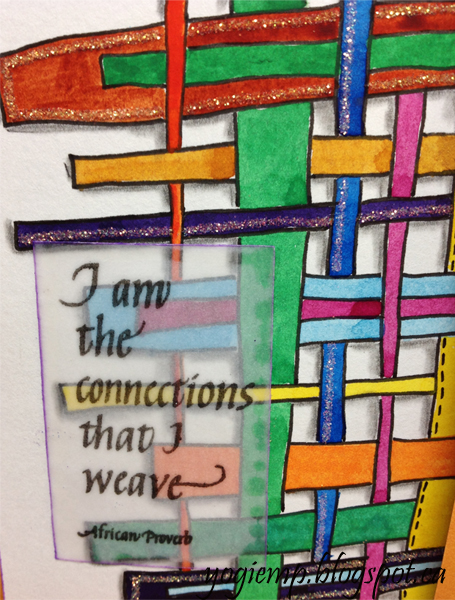 Side folded my mango cardstock which was a 12 x 12" cardstock. So after folding it to create a 5"w card, had the 2" piece leftover and said OK lets make a flap... Drew my weave design on to a piece of 90# Canson Biggie watercolor paper (smooth side), then went over the lines with a .3mm black fine line pen. Painted with my QoR watercolors in vibrant colors. When dry. shadowed two sides using an HB pencil and paper stump to blend. Added glue lines on a few of the stripes using a Quickie Glue pen and sprinkling with Stickles dry glitter "Diamond". On one of the stripes I added faux stitching. Trimmed my design down to fit the front leaving a 1/8" border all around. Inserted aqua square brads in the four corners, then adhered the watercolor to the card front. Stamped the quote on to clear vellum using Versafine Black Onyx and clear embossed. Punched a couple small holes for my closure brads. |