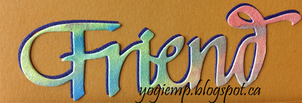 Inside of the flap: die cut the word "Friend" from the Perfect Pearls WC background and also from the purple cardstock. Adhered the two together then adhered to flap. |
