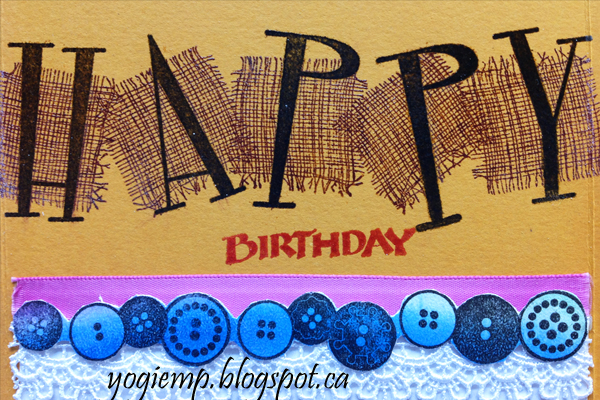 Stamped the word "Happy" (MSE "Retro Caps" font set) using the black and clear embossed. Stamped the woven blocks (Stampendous Perfectly Clear "Mesh Border") using Distress "Seedless Preserves" and clear embossed (cleaning off the embossing powder from the letters prior heat setting). Stamped the row of buttons (Flourishes "Country Charm Borders" set) using the black on the Perfect Pearls WC bkgr'd and clear embossed. Fussy cut around the buttons. Stamped the word "Birthday" (Quietfire Design) using Distress "Barn Door" and clear embossed. Trimmed down and adhered a piece of white stationary to the inside of the card. Adhered a piece of fuchsia colored satin ribbon, a piece of beautiful white lace and then the button border. Had some left over Perfect Pearls WC bkgr'd, so cut some strips to weave a design and hide my brad arms. |