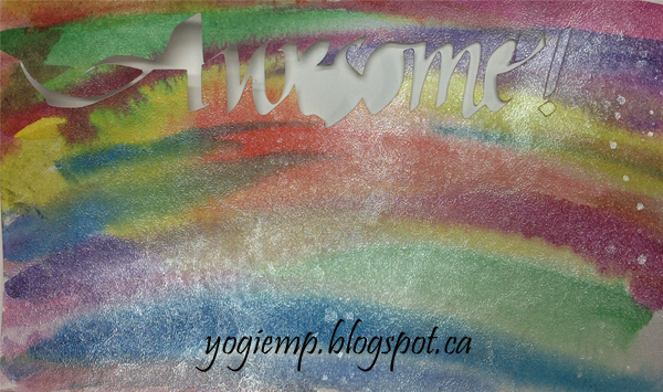 On the top of the flap: I had a left over piece of Soft Finish cardstock, so I painted a background using the same colors as the weave, then sprayed with Perfect Pearls "Perfect Pearls" spray. Love the way it muted the colors for contrast (see below). I eCut the word "Awesome" and eCut a shadow layer from purple Bazzill monochromatic cardstock, layered the two together and then adhered to card flap. |