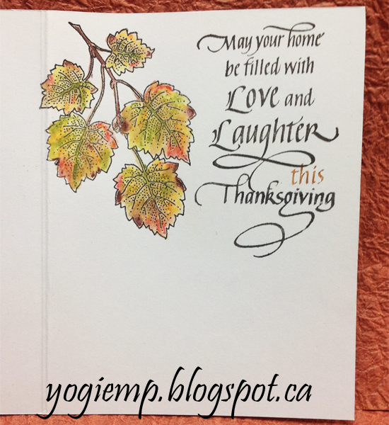 On the inside: Stamped one of the other leaf images from the Autumn Poppy set using the black and clear embossing. This time I used my Derwent Inktense watercolor pencils. Stamped the quote with the black. Stamped the "Thanksgiving" using a Black Distress marker to be able to get only the word without the other parts of the quote... Stamped the word "this" using "Rusty Hinge" marker. |