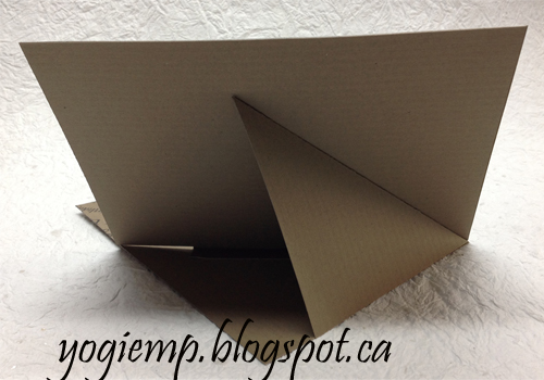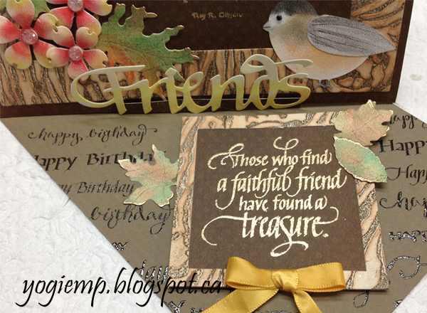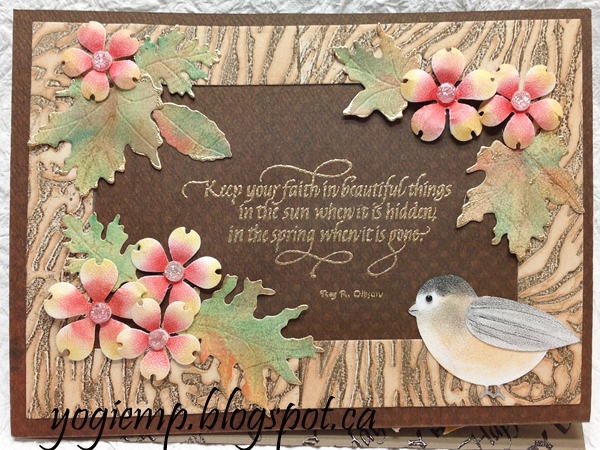 I scored and folded my brown cardstock to create the easel (see back below). Cut another piece of the brown cardstock for my front and covered it edge to edge with a brown on brown polka dotted scrapbook cardstock (Bo Bunny "Chocolate Dot"). Adhered it all to the front. Inked up the Bark embossing folder with Distress "Ground Espresso", misted with water and ran through my machine. Repeated the process. Then sponged "Tea Dye" all over. Folded the cardstock at the join of the 2 embossings and cut them apart with an x-acto knife, then spliced them together again. Unless you know they were spliced is really hard to see... Used Spellbinders "Matting Basics "B" 5 x 7 die set to cut out the frame. Adhered to card front. For the leaves, applied the Pan Pastels to the smooth side of the cardstock. It adhered beautifully... (see pastel background pic above). Die cut the leaves and used a small balled stylus to add veining, then touched areas with more pastels for contrasts. Hit the edges with a Versamark pad and embossed with Queen's Gold. Stamped the quote with Versafine Toffee and embossed with the gold. |