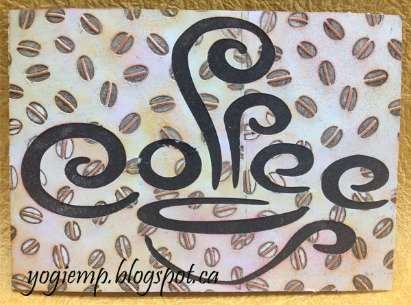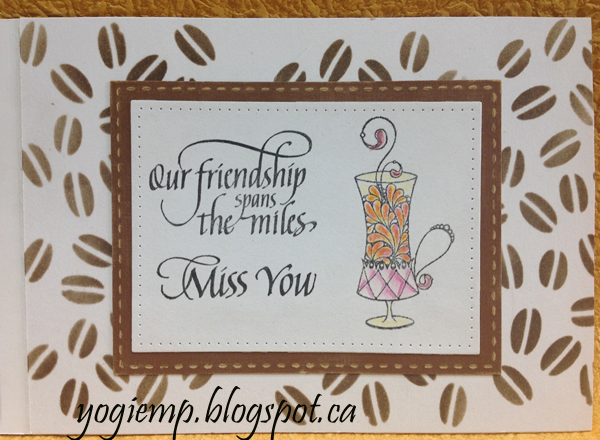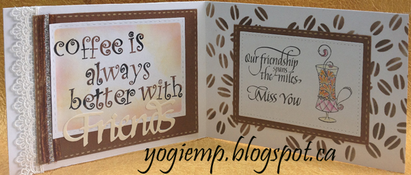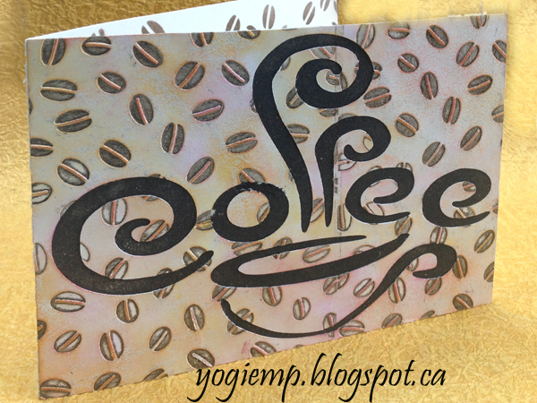 On the inside - right: stenciled a piece of white cardstock using the "Coffee" stencil and Distress "Ground Espresso". Stamped the quote and sentiment using the black and clear embossed. Die cut with the "Stitched Rectangles" die. Stamped the cup (Impression Obsession "Smell The Coffee"). colored with Prisma colored pencils. Die cut the brown layer and sanded the high points. Adhered both together then onto the card. |