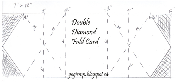 To create this size card, cut a piece of cardstock 7"h x 12" w. Score at 3", 4.5", 7.5" & 9". Along the top edge, Pencil mark at the 1.5" & 10.5" Along the vertical edge, pencil mark 3.5" Score the diagonal lines. Cut away the cross hatched areas. fold as indicated with valley fold or mountain fold. Decorate... If you are using 8.5" x 11" cardstock, to get the same size card, cut 2 pieces of cardstock to 7"h x 6"w. splice the two pieces together by adhering a decorative piece (the bird cage design). |