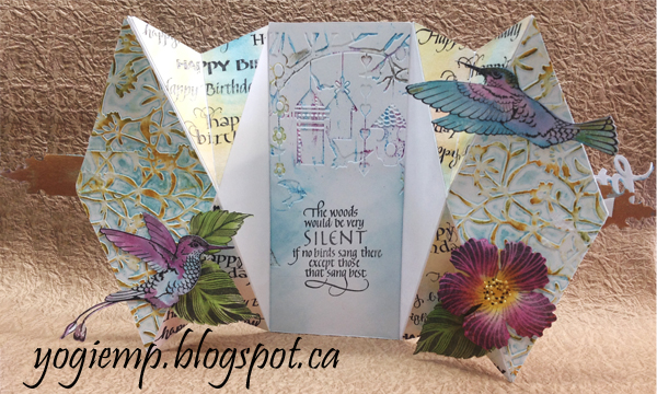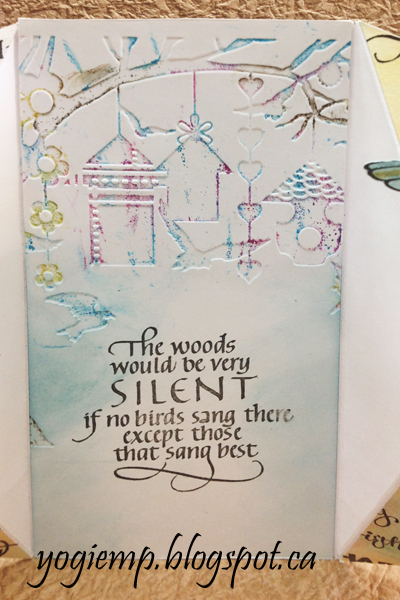 Inked an embossing folder (Cuttlebug "Floral Screen") using Distress "Broken China" direct to folder, misting with water and embossing. Repeating the process to get a longer embossed design. Removed from folder and hit the high points with "Wild Honey", then with a touch of "Crushed Olive". Traced my diamond shape and transferred it to the back of my embossed piece. Adhered to left and right of card. Stamped another piece of white cardstock with all the birthday sentiments using Versafine Black Onyx and clear embossed. Sponged some of the broken China, the Wild honey and some "Mowed Lawn". Again created a template of the triangles, cut the stamped background and adhered in place. Debossed the bird cages design inking the folder with the various pads, misting with water and embossing. Sponged some of the Broken China around the edges. Trimmed down and adhered to inside of card. Dried. Stamped the quote using the black and clear embossed. |