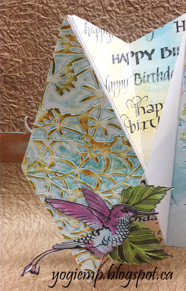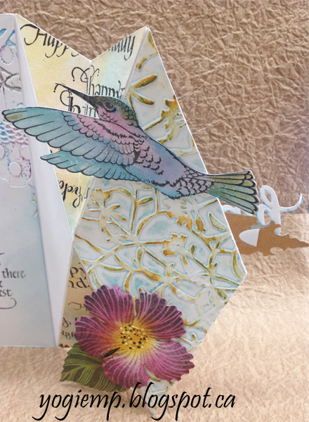 eCut the various bird and floral elements using Designs By Ryn "Hibiscus" and "Hummingbird 2" sets. Colored with watercolors, tooled the flowers then adhered to card. Applied Wink of Stella on the birds and Liquid Pearls "Buttercup" and "Onyx Pearl" dots to the flower center. |