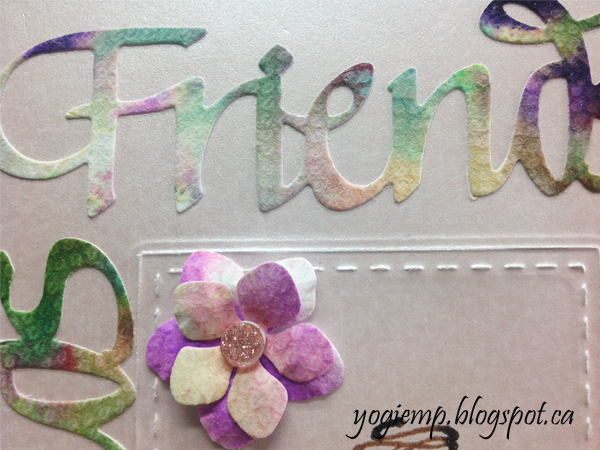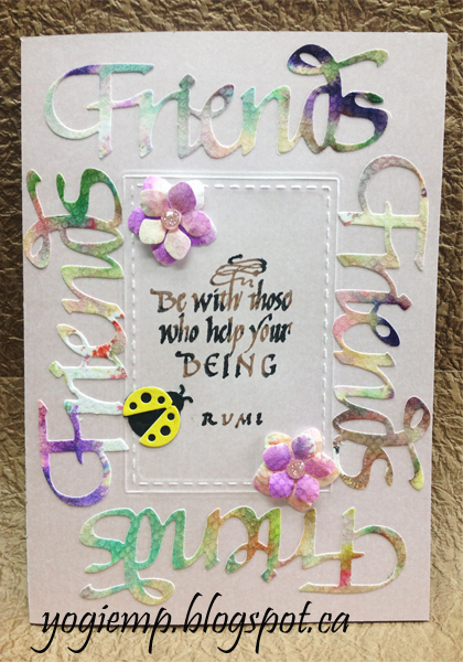 Adhered my "Friends" words. Tooled the flowers then adhered 2 layers together and then on to card front. Added a textured light pink jewel to the flower centers. Die cut the lady bug pieces, colored the black part with a Zig Writer and the yellow part with Winsor and Newton Permanent Marker. Inked the yellow with Versamark and clear embossed. Adhered to front. |