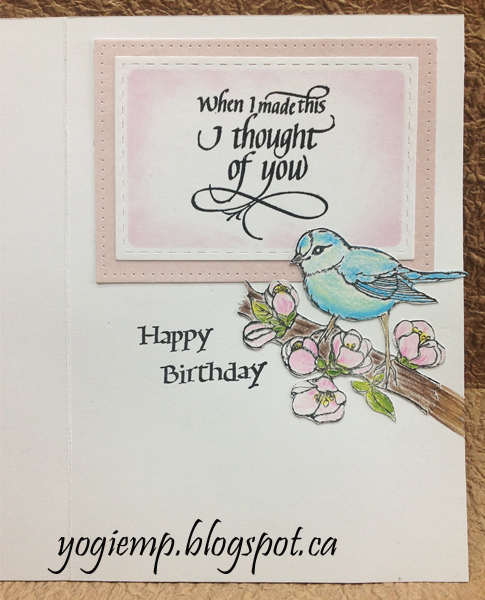 On the inside: On a piece of white cardstock, stamped the elements for the quote using a stamp positioner. First, inked the stamp, masking the word "saw" using the black soot, clear embossed. Inked the word "made" with the black, stamped it on some tracing paper to get my position, reinked the "made" word and stamped onto my quote, clear embossed. Die cut with the stitched rectangles and sponged with a dirty pink sponge. Die cut the next size up of rectangle from the pearlescent paper and adhered the 2 layers together then on to the card. Created an eCut file of the Robin stamp (which I didn't color as a robin...), cut from white cardstock, stamped with the black and colored with Prisma colored pencils. Adhered to card. Cut the "Happy Birthday", positioned on my acrylic block, inked with the black, stamped and clear embossed. |