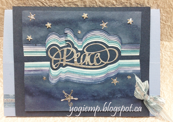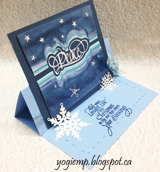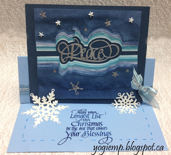 I used Distress pads - some of the layers were sponged (S) and other were direct to paper (D). in stacked order: "Tumbled Glass" S; "Tumbled Glass" D; "Broken China" D; "Stormy Sky" S; "Chipped Sapphire" S; "Faded Jeans" S; "Faded Jeans" D; "Stormy Sky" D; Adhered the layers slightly off set, trimmed edges and adhered to a piece of dark blue cardstock5"h x 6"w. Inked one of the die cut words with Versafine "Smoky Grey" and embossed with Silver embossing powder. Scored and folded my mid toned blue textured cardstock to create the easel. Adhered a piece of light blue/silver Sari ribbon. Adhered the stacked layer. Adhered the bow. Added white rhinestone stars and silver Peel Off snowflakes. |