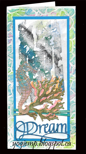 Colored some narrow ribbon using Distress blue pads, dried, and adhered to faux lace panel. Adhered panel to card front. eCut the seahorse and coral sprigs (Designs By Ryn "Sea Creatures 1" set), stamped and painted. Die cut the word "Dream" from white cardstock. Inked with "Mermaid Lagoon" and embossed with Emerald Creek Hot Stuff "Blue Sparkle" embossing powder.