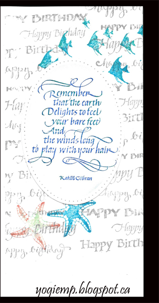 On the inside: created a collage stamped background using various "Happy Birthday" words inked with "Weathered Wood". Stamped the school of fish and the starfish (Designs By Ryn "Sea Creatures 2" set) using various Distress pads. Stamped the quote onto white cardstock using "Blueprint Sketch" and hitting here and there with "Peacock Feathers", clear embossed. Die cut using Elizabeth Craft Designs "Stitched Oval" set. Sponged around edge with "Tumbled Glass". |