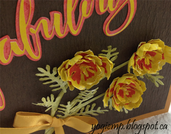 Die cut the marigolds from white cardstock and colored with Distress acrylic Daubers "Mustard Seed", "Peeled Paint" and a touch of "Forest Moss". Added the deeper red flower detail with a Prismacolor marker "Scarlet Lake". Tooled with a loop tool and assembled. eCut the "Fabulous" from white cardstock and also a shadow layer. Painted the word with the yellow dauber and the shadow layer with "Walnut Stain" both while on the mat, then very very carefully removed the word layer (those thin strokes are really thin... but gorgeous), adhered it to the shadow layer. Die cut the letters for the "You're" using Elizabeth Craft Designs "alphabet" die set. Painted them with the yellow dauber and hit the edges with the red marker. Adhered all the elements adding a yellow narrow ribbon bow. |