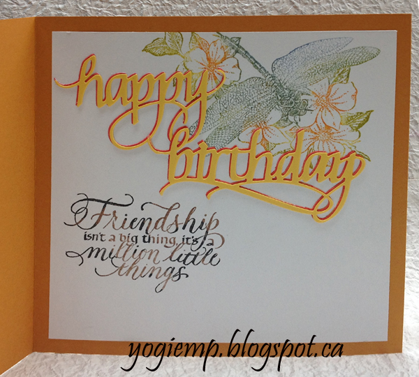 On the inside: Stamped the dragonfly (CC Designs "Dragonfly Floral") on white cardstock, inking the stamp with Distress minis, misting with water and then stamping. Die cut the "Happy Birthday" from a yellow and red cardstock. Adhered to two layers slightly off set and then onto the inside. Stamped the quote using Versafine "Vintage Sepia" all over and then here and there with Black Onyx, clear embossed. Adhered the inside element to the inside of the card.