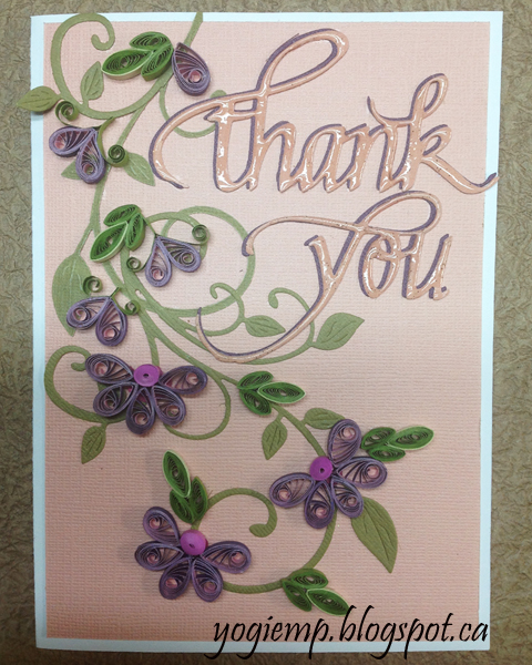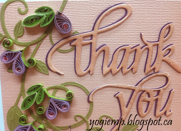 Die cut the leaf sprig (Cheery Lynn Designs "Fanciful Flourish") from an olive toned Core'dination cardstock. Adhered to card front, splicing a 2nd die cut strategically. Then adhered my quilled elements. Die cut the "Thank You" from the same background cardstock and a deep purple layer. On the top layer, inked with Versamark and embossed twice with clear UTEE. Adhered both together slightly off set and then on to the card front. |