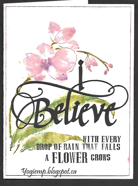 Stamped the Penny Black "Gentle Whisper" on 90# HP watercolor paper using my Misti and Distress pads ("Victorian Velvet" all over the flowers and then here and there with "Wilted Violet; "Forest Moss" on the leaves and stems and then hitting here and there with "Pine Needles" and "Shabby Shutters") misting with water and stamping, then misting the paper with water to get the stamped image to bleed. Dried and reinked my stamp and stamped without misting. Trimmed the page down to fit my card with a border around. Inked the edges of the watercolor paper with the Velvet and misted, dried and adhered to card front. Die cut the "i" which is actually an exclamation mark in the "Calligraphic Elements 1" set, and the "Believe" from black cardstock. Adhered to front. Stamped the rest of the quote using Just Rite "Brayton" alphabet set using Versafine Black Onyx and clear embossing. |