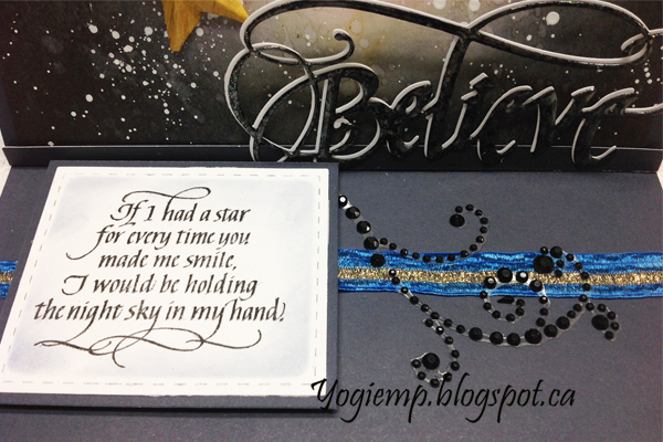 On the floor: Die cut the word "Believe" from a dark blue cardstock and a white cardstock. Inked the dark blue one with Versamark and embossed with Emerald Creek "Fractured Ice" embossing powder. Adhered the two together offset, then onto a narrow folded lip which acts as part of my stopper. Stamped the quote onto white cardstock using Versafine "Black Onyx" and clear embossed. Die cut with a "Stitched Rectangle" (Elizabeth Craft Designs), moving the die to get a square cut out. Sponged the edges with a dirty blue sponge. Adhered it to a dark blue cardstock then onto the floor with 3D foam tape. Adhered a piece of dark blue/gold Sari ribbon and added a black rhinestone flourish. |
