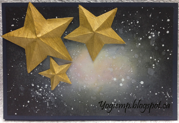 Created the Celestial Sky (see step by step pics below) created and electronically cut the 3D stars from white cardstock. Painted with Distress dabbers acrylic paint "Tarnished Brass". Adhered to front. |