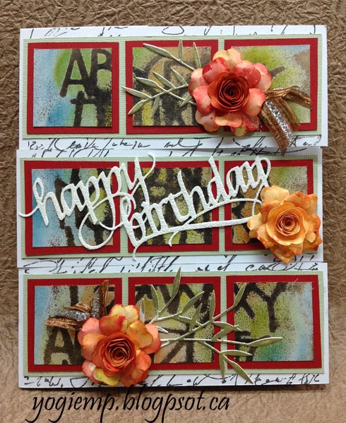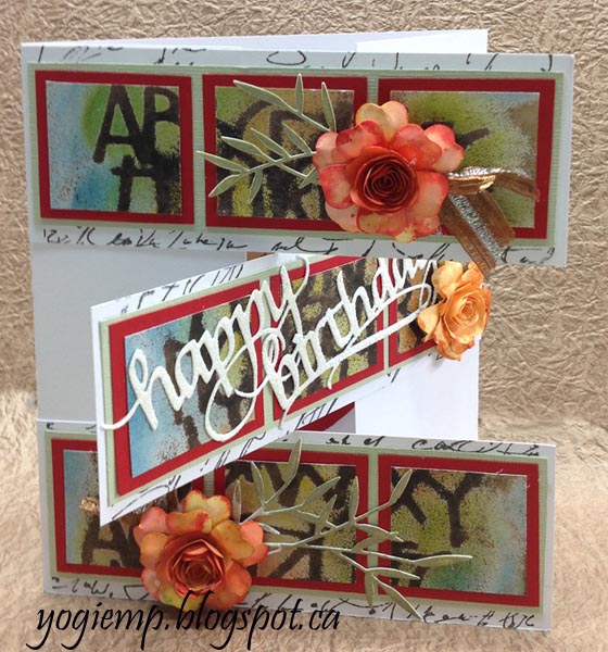 Raided my stash for the die cut Hybrid Heirloom Roses (Die-Namics) colored with Brusho's. Die cut the foliage from heavy Soft Finish cardstock and colored with Pan Pastels. Die cut "Happy Birthday" from white cardstock, inked with Versamark and embossed with Emerald Creek Hot Stuff "Soft Fallen Snow" (love the texture...) Adhered all my decorative elements, then added a couple snips of brown/silver Sari ribbon