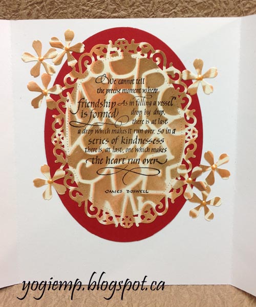 On the inside: used a Gelli Plate print of another stencil I had made from my own calligraphy (from clear plastic), die cut with Spellbinders "Floral Ovals". Adhered to a die cut red textured oval (Spellbinders Grand Ovals). Adhered to inside of card. I had some of the Gelli Plate paper left over so die cut the flowers (ECD "Bunch of Flowers 2"). Added an orangey center with Liquid Pearls. |