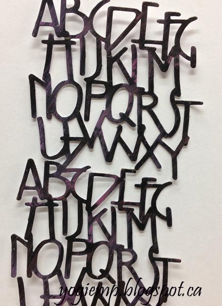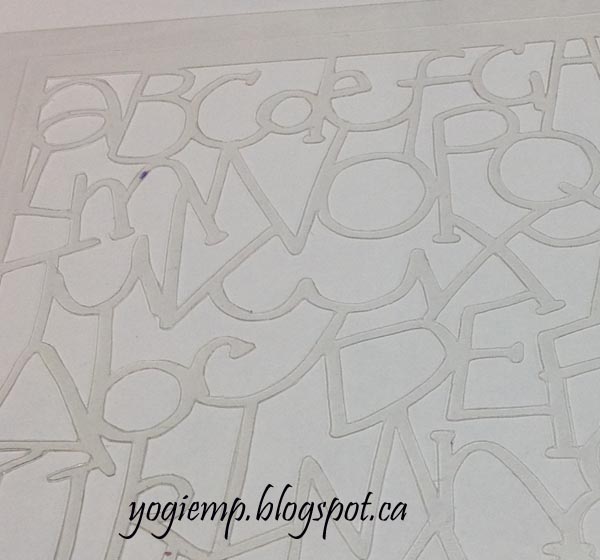 Stamped the text background (Impression Obsession "Script") on to white cardstock using Versafine Black Onyx. Cut it in to 3 equal strips and alternately adhered them to the 2.5" flaps I had created a couple stencils a while back from my own calligraphy using my Silhouette machine to eCut the stencils. The one for the front was cut from white heavy cardstock, inked on the front and clear embossed a couple times to make it water resistant.