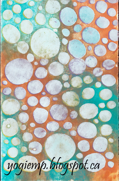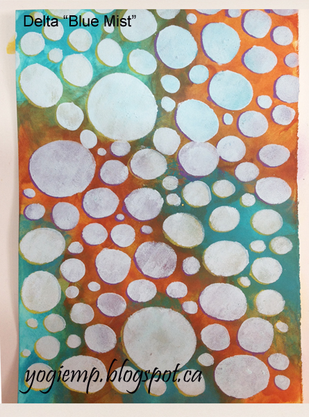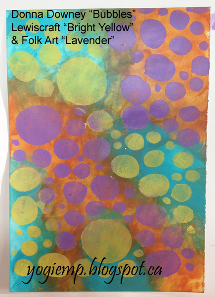 Background Technique: Stencil Shift (https://www.youtube.com/watch?v=7nujTk7tGzM&feature=share) Step 1: On white cardstock sponge on paints in a blending way. (Ceramcoat "Blue Mist"; "Pigskin"; Then build up the colors with Folk Art "Aqua Bright"; Ceramcoat "Georgia Clay"; & "Laguna" Downey Downey "Bubbles", sponge using Lewiscraft "Bright Yellow"; Folk Art "Lavender". Dry. Step 2: Shift the stencil slightly to the right and sponge with Ceramcoat "Blue Mist". Dry. Step 3: sand all over lightly until desired distressed look is achieved. |