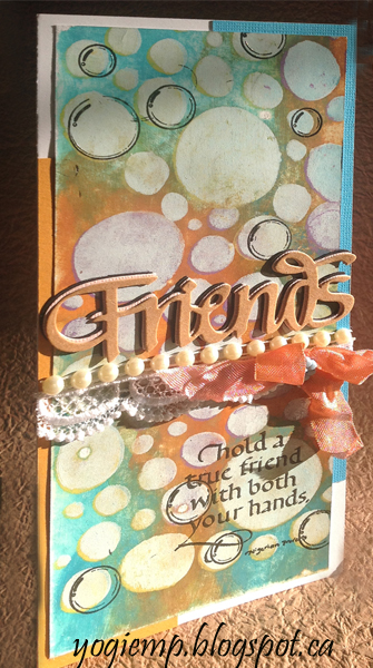 Used some scraps of orangey and bluish cardstock for border edges. The bubble background was made on 110# white cardstock (see below for the details) Trimmed it down and using a stamp positioner, stamped parts of a bubble stamp (Anita's Sugarloaf "Bubbles") into some of the circles using Versafine Black Onyx and clear embossing. Stamped the quote with the black and clear embossed. Adhered the background to the card front. Die cut the "Friends" word from Kraft-Tex paper fabric, and also from a light pink textured cardstock and black cardstock. Adhered all 3 layers together, off shifting each layer. Adhered to card front. Adhered a row of ribbon pearls using a hot glue tool. Adhered some white lace adhering with double sided tape. Tied a bow from salmon toned ribbon and adhered with a glue tool, and then adhered a blue button. |