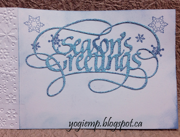 Inside: Stamped the snowflakes using the stormy sky and embossing with the pearlescent embossing powder Die cut the "Season's Greetings" from white cardstock, inked with the stormy sky and embossed with the turquoise shimmer . Sponged some blue around the edges.