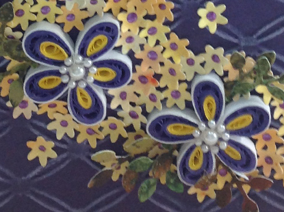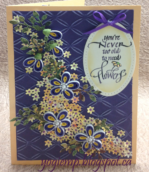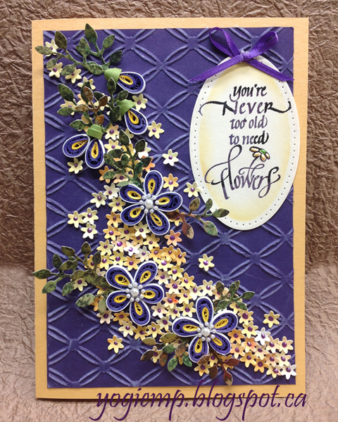 Cut a piece of purple cardstock 1/4" smaller all around. Embossed with Couture Creations "Tied Together" embossing folder, then hit the high points lightly with a Distress pad "Picket Fence". Adhered to card front. Created a yellow background paper from 90# CP watercolor paper and Brusho powders in various yellows, spraying with lots of water. Dried and die cut using Impression Obsession "die 140-D". Tooled them on a piece of fun foam and a medium sized balled stylus. Adhered them all to my card front. Adhered my quilled elements, adding the floral pearl centers. Die cut the leaves (Elizabeth Craft Designs "Leafy Branch" from a greenish background paper I had in my stash. Pinched off sections and adhered under quilled flowers. Added Liquid Pearls "Orchid" dots in the centers of all the mini yellow flowers. Stamped part of the quote and the flowers design element stamp using Versafine "Imperial Purple" and hitting here and there with Black Onyx, clear embossed on cream toned cardstock. Die cut the smallest oval (Elizabeth Craft Designs "Stitched Ovals"), sponged some "Scattered Straw" around the edges and adhered to card front. Added some Liquid Pearls (Buttercup & Key Lime) to the flower and a small narrow ribbon purple bow to the oval |