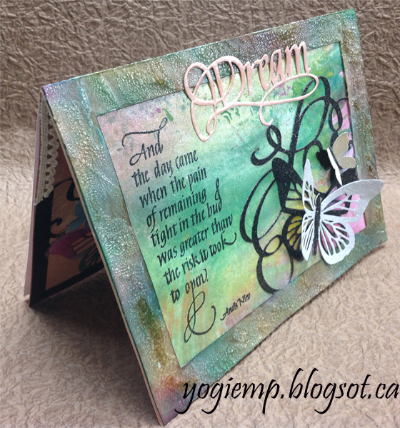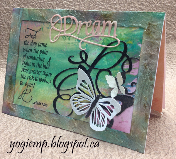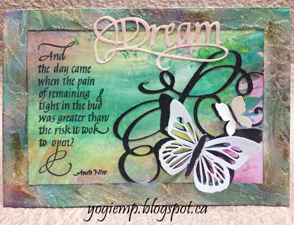 The under layer is part of the Tim Holtz "Faux Marble" technique done on white cardstock using acrylic daubers on a craft sheet, misting with water (I used Perfect Pearls "Perfect Pearls" mist) and swishing your cardstock through the wet paint, misting with more water, tilting etc to achieve the marble look. This background was done as a 2nd generation through the paint.. Dried and adhered to frame. Trimmed off the excess. Adhered the glittered butterflies by the bodies only. Stamped the quote using Versafine Black Onyx and clear embossed. Die cut the word "Dream" from cream toned cardstock, sponged with "Spun Sugar" and clear embossed. Adhered to frame. |