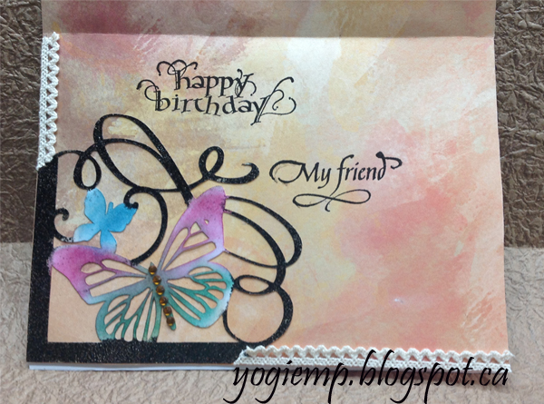 On the inside, I adhered a piece of scrapbook paper that matched my colors. Sponged some of the colors from the front to my butterflies and clear embossed. Carefully inked the rest of the flourishes with the brown and embossed with the bronze. Adhered to inside. Added the lace trim to the borders. Stamped the sentiments with the black and clear embossed. Final touch added the amber rhinestones to the large butterfly. |
